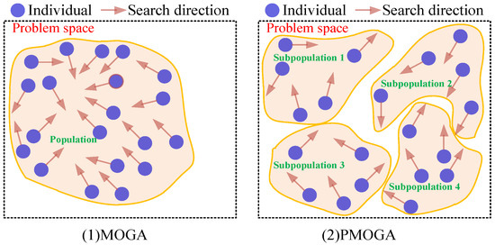 Although the NSGA-II algorithm has been successfully employed to solve multi-objective problems, this method still has some disadvantages: (1) considering the worst case of all operations, the overall complexity of NSGA-II exhibits an approximate square growth [30], i.e., O(M·N2), where M and N denote the number of objectives and individuals, respectively; (2) at the latter evolution process, the diversity of individuals will significantly reduce, and the population tends to emerge the premature convergence [29]. When handling large-scale engineering problems, NSGA-II may take a long computation time to finish the entire evolution process, but the pseudo Pareto optimal solutions are obtained in the end. Then, inspired by some earlier studies on the small population technique [40,41] and multi-core parallel technology [20,21], the PMOGA is proposed in this section to alleviate the above problems in MOGA.