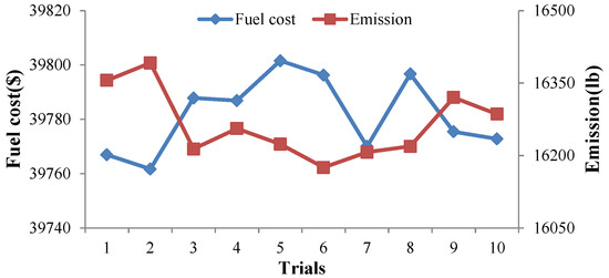 From Table 3 and Figure 9, it can be found that the proposed method can gives a group of solutions closer to the true optimal Pareto front compared with other evolution techniques, which proves that PMOGA can be an effective approach to solve complex multi-objective problems. Meanwhile, the results again prove that there is irreconcilable contradiction between the economic objective and the environmental objective. For example, in the best economic scheme, the fuel cost of PMOGA is reduced by 1867 ($) compared to the MOGA. In addition, the results in Table 4 and Figure 10 indicate that all the variables can satisfy the preset maximum and minimum constraints of the SEEHTS problem, which proves the validity of the proposed algorithm to deal with complicated constraints. Hence, from the above analysis, it can be concluded that PMOGA is an alternative method to handle the hydrothermal system scheduling problem.