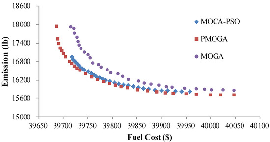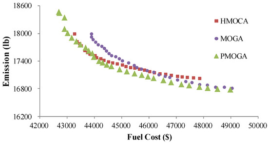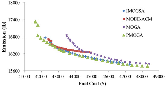 Moreover, to further show the effectiveness of the proposed technique, its results is compared to the results of other methods in Table 5, including differential evolution (DE) [43], quantum-behaved particle swarm optimization with differential mutation (QPSO-DM) [44], and improved quantum-behaved particle swarm optimization (IQPSO) [1]. For the ELS case, the fuel cost is the only objective to be optimized, and it is not necessary to compare the emissions. Similarly, for the EES case, the emissions are the objective we care about, thus the fuel cost is not compared. From Table 5, it can be clearly observed that compared with methods reported in previous literatures, PMOGA provides results with fewer fuel cost and pollutant emissions in different cases. From the comparison with DE, QPSO-DM and IQPSO, the proposed algorithm can reduce the total fuel cost by 1870 ($), 279 ($) and 729 ($) in the ELS case; while the emission obtained by PMOGA is reduced by 2486 (lb), 1888 (lb) and 1996 (lb) in the EES case. In the CEES case, PMOGA can reduce simultaneously the fuel cost and emission compared with the DE and IQPSO, while its solution is not dominated by that of QPSO-DM. Thus, PMOGA is able to provide better solutions in comparison with other methods while satisfying all the constraints of the hydrothermal system.