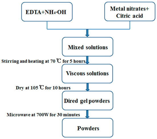 A series of BaBO3-δ (B = Co, Cr, Cu, Fe, Mn, Ni, Zn, Zr), ACoO3-δ (A = Mg, Ca, Sr, Ba) and Ba0.5Ln0.5CoO3-δ (Ln = Mg, Ca, Sr) were synthesized by microwave-assisted EDTA (Ethylenediaminetetraacetic acid) synthesis method [16,17,18,19,20,21]. For preparing BaCoO3-δ as example, the detailed microwave-assisted EDTA synthesis procedure is outlined in the flow chart shown in Figure 2. Metal nitrates Ba(NO3)2 and Co(NO3)2·6H2O were used as the raw materials and all of analytical purities. A design amount of metal nitrates and citric acid were dissolved in the NH3-EDTA solution. The mole ratios of EDTA: citric acid: total metal ions were controlled as 1:1.5:1. NH4OH solution was employed to adjust the pH value of precursor solution. The solution was then gently heated and stirred at 70 °C for 5 h and further dried at 105 °C for 10 h, respectively. Finally, the gel was irradiated with microwaves at 700 W for 30 min. The resultant black powders were characterized.