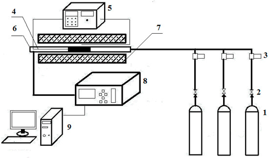Schematic diagram of fixed-bed reaction system. (1) Gas cylinder; (2) valve; (3) flow controller; (4) thermocouple; (5) temperature controller; (6) quartz reactor; (7) horizontal tube furnace; (8) gas analyzer; (9) data acquisition system.