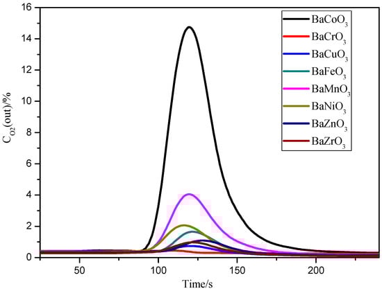 The effects of B-site substitution by different transition metal ions on the oxygen production performance of BaBO3-δ were studied. Figure 6 shows a comparison of the oxygen desorption performance for BaBO3-δ (B = Co, Cr, Cu, Fe, Mn, Ni, Zn, Zr). It indicates that the substitution of Co in the B-site with different transition metal ions had more significant effects on the oxygen desorption performance compared with A-site substitution. The B-site Co ion substituted by Cr, Cu, Fe, Mn, Ni, Zn, Zr reduced the oxygen desorption amount of BaCoO3-δ. It indicates that BaCoO3-δ has the best oxygen desorption performance among the above-mentioned A/B-site–substituted ACoO3-δ and BaBO3-δ. Therefore, BaCoO3-δ was selected as the candidate for further research.
