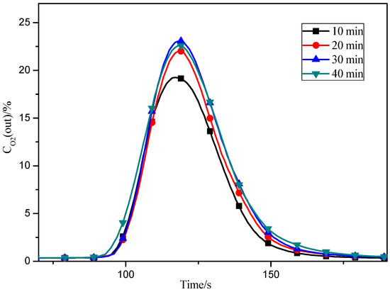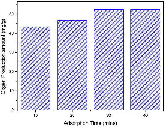 In order to investigate the effects of the adsorption time on the BaCoO3-δ oxygen production performance, BaCoO3-δ was exposed to an air flow for various adsorption times (10, 20, 30 or 40 min, respectively) at 850 °C in the adsorption process. The desorption performance curves and the oxygen desorption amount for BaCoO3-δ with different adsorption times are shown in Figure 7 and Figure 8, respectively. As shown in Figure 7 and Figure 8, the oxygen production amount increased with the increase of the adsorption time, varying from 10 min to 30 min. When the adsorption time increased continuously up to 40 min, the oxygen desorption amount declined a little. Considering energy conservation and reducing the cycle time in order to improve the efficiency, it was suggested that 20 min of adsorption time is more efficient than a longer adsorption time. The adsorption time of 20 min was then chosen and further applied to study the effects of other operation conditions on the oxygen desorption performance of BaCoO3-δ.