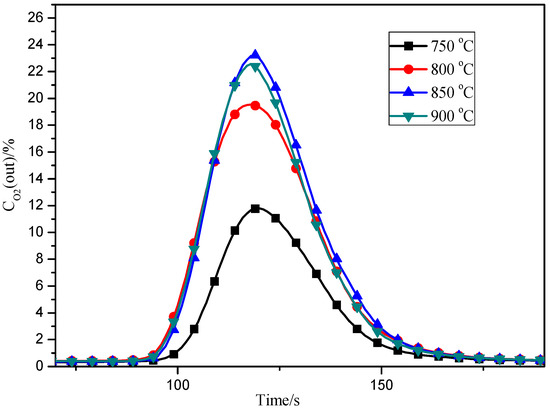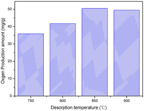 Figure 11 presents the desorption performance obtained for BaCoO3-δ at different desorption temperatures varied from 750 °C to 900 °C (with the same adsorption temperature at 850 °C). As shown in Figure 12, the alteration of the oxygen desorption amount based on different desorption temperatures has the same tendency as that of the adsorption temperatures. It is clear that 850 °C was the ideal desorption temperature in this condition. It is known that the reaction between CO2 and BaCoO3-δ is a gas-solid reaction. The increased desorption temperature can lead to improved kinetics of the carbonation reaction. However, there is a decrease in the oxygen release quantity when the temperature reaches 900 °C. It might be caused by the decrease of the sample surface area. The high reaction temperature is conducive to promoting CO2 diffusion though the product layer, making the particles aggregate with a smaller surface area, which slows down the reactions. Therefore, an optimum oxygen desorption temperature for the selected perovskites appeared in the oxygen desorption process.