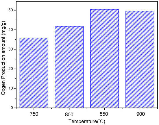 Figure 9 compares the oxygen desorption curves of BaCoO3-δ at different adsorption temperatures varied from 750 °C to 900 °C (with the constant desorption temperature at 850 °C). The oxygen desorption amount calculated from the Equation (2) is given Figure 10. It shows that with the increase of the adsorption temperature, the oxygen desorption amount increased first, and then decreased. It may be because while the adsorption temperature is below 850 °C, the adsorption reaction is controlled by the kinetic process. A larger amount of oxygen is adsorbed due to the faster adsorption kinetics at a higher adsorption temperature. This leads to more oxygen desorbed in the desorption step. However, when the temperature is higher than 850 °C, the adsorption reaction is controlled by thermodynamics. Since the oxygen adsorption process for BaCoO3-δ is exothermic, the higher temperature has unfavorable effects on the adsorption process. Therefore, 850 °C was the optimal adsorption temperature for BaCoO3-δ in the current study.
