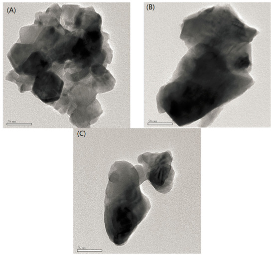 Figure 13 compares the morphologies of the fresh BaCoO3-δ powders, the samples after six desorption cycles and the reverted products of BaCoO3-δ after six test cycles. The fresh BaCoO3-δ powders, as seen in Figure 13A, demonstrated a homogeneous morphology and most of the particles were multifaceted, resembling hexagonal shapes. It also shows that the shapes and sizes of the fresh BaCoO3-δ were mostly uniform and the average particle size was about 50 nm. When the fresh sample underwent six cycles of the desorption processes, as shown in Figure 13B, the particles became non-uniform in shape, and were composed of much bigger and irregularly shaped agglomerates, which were further merged together to form a relatively smooth surface. Figure 13C shows the reverted products of perovskite after six test cycles. As seen in Figure 13C, scattered spherical shapes could be found with a larger average particle size compared to the fresh sample.