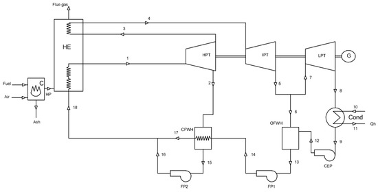 Flow diagram of solid fuel-fired heat and power plant model (modified from [40]).