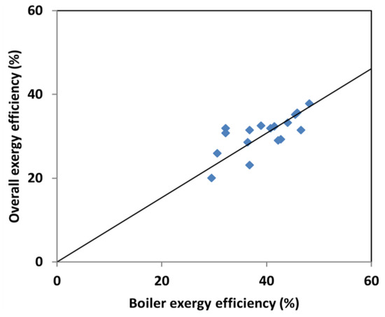 Biomass co-fired with coal in traditional coal-fired boilers presents one combination of utilising fossil and renewable energy that derives the greatest benefit from both types of fuel; it leads to an effective reduction in CO2 and SOx emissions, and often NOx emissions too. It represents an attractive alternative for reducing emissions of greenhouse gas from coal-fired boilers [80]. Coal-biomass co-firing prevents the concentration of chlorine, which can otherwise result in the formation of harmful alkaline and chlorine compounds on the heat transfer surfaces in boilers [81]. Progress has been made over the past years in developing the co-ultilization of biomass fuels in coal-fired boiler plants [82]. Exergy analysis can nevertheless be used to evaluate performance in order to identify both the magnitude and the locations of imperfections in the process, with the aim of improving the efficiency of the plant. Reports pertaining to exergy analyses of biomass co-combustion processes are very few and far between: Table 6 shows a summary of previous work performed in this field.