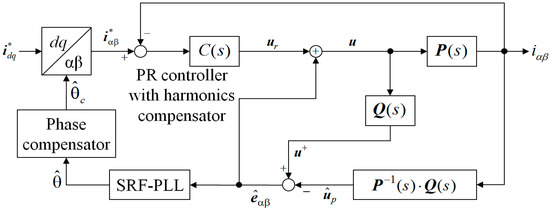where and are the proportional and resonant gains of the PR controller, respectively; is the bandwidth; and is the center frequency. To determine the eventual reference voltages of a grid connected inverter, the grid voltages are added into by a feedforward manner as follows:
