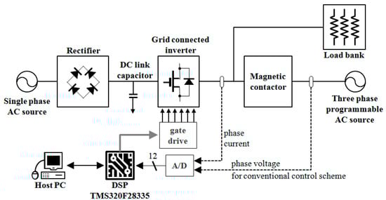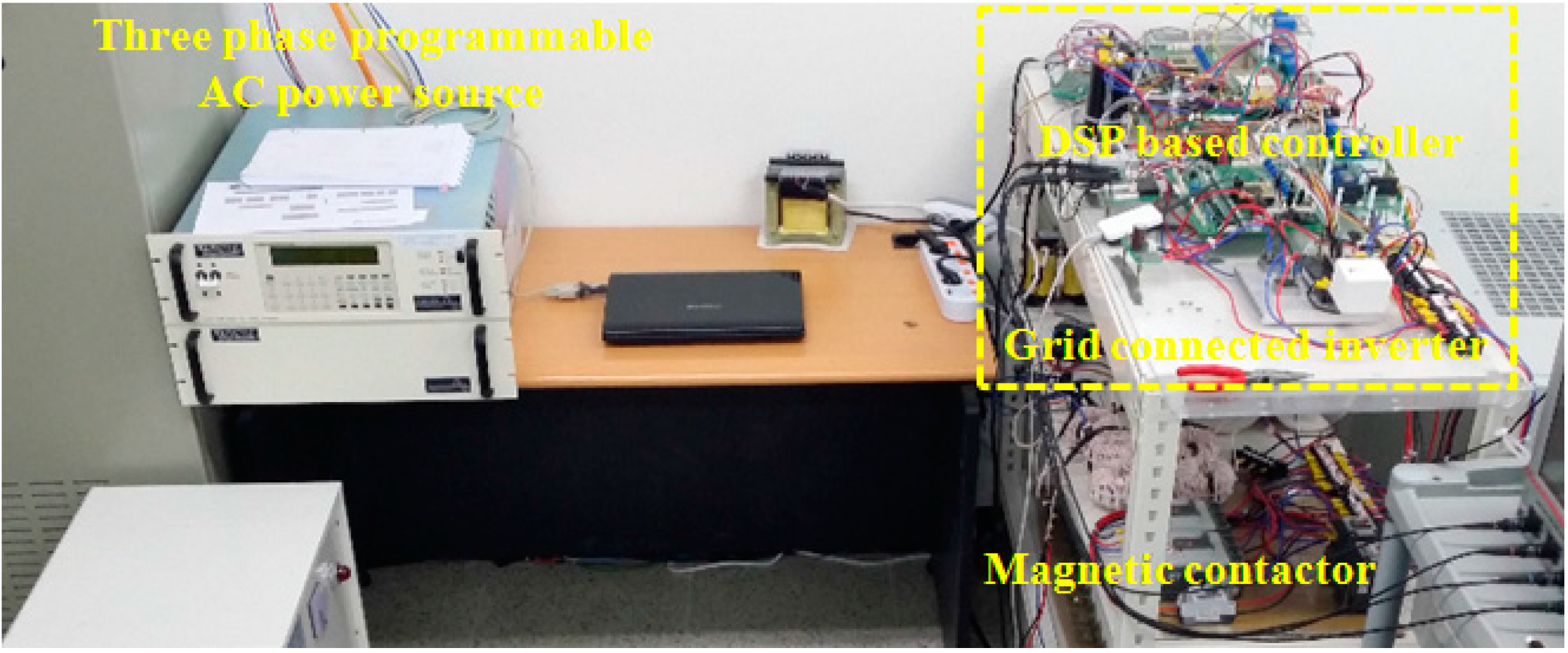 Figure 4 shows the experimental test setup consisting of a DSP based controller, three-phase grid connected inverter, magnetic contactor (MC) for grid connection, and three-phase programmable AC power source. The system parameters of the experimental system are listed in Table 1.