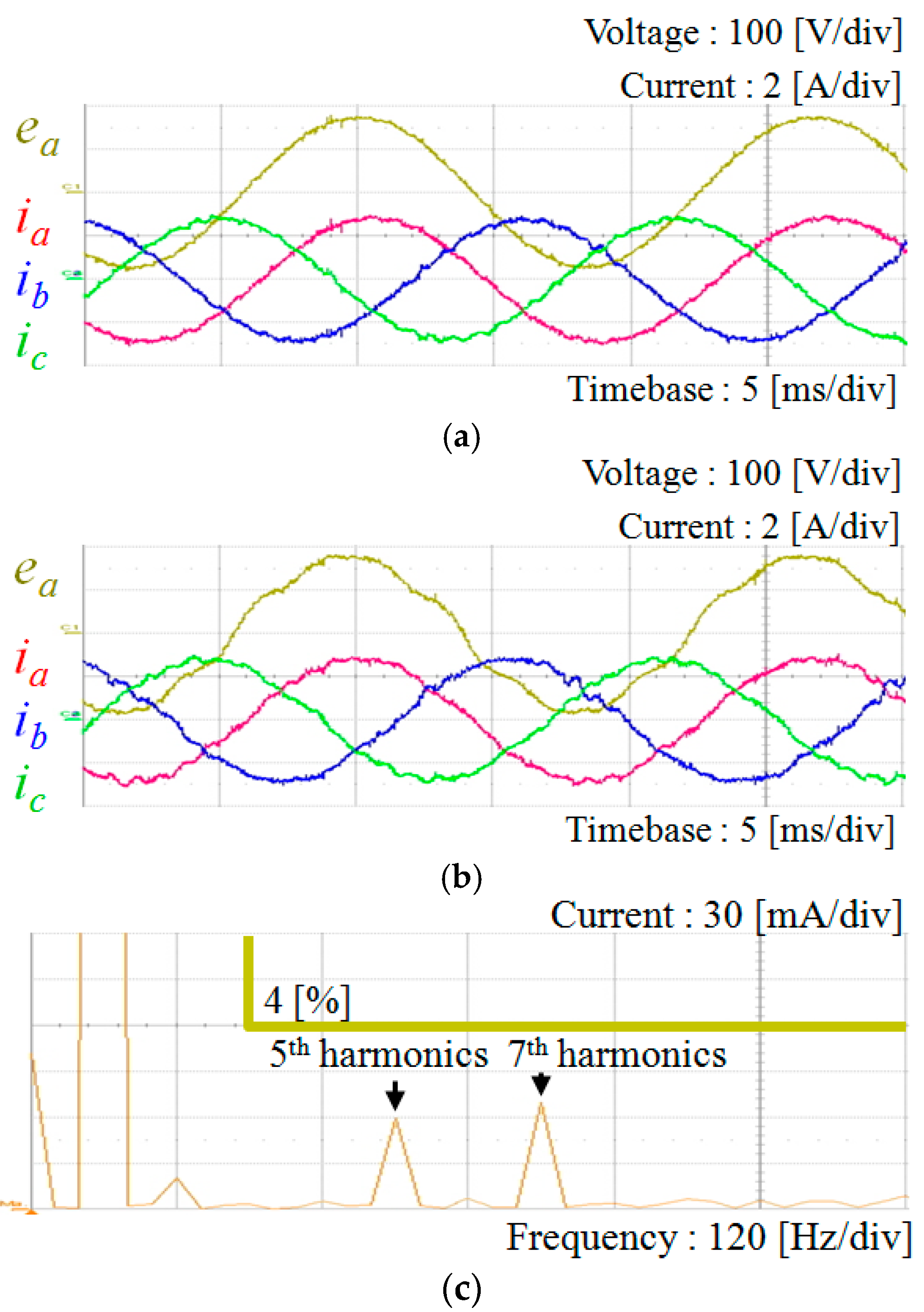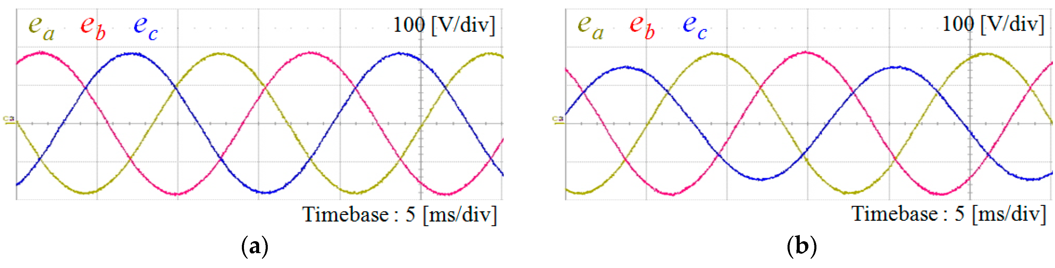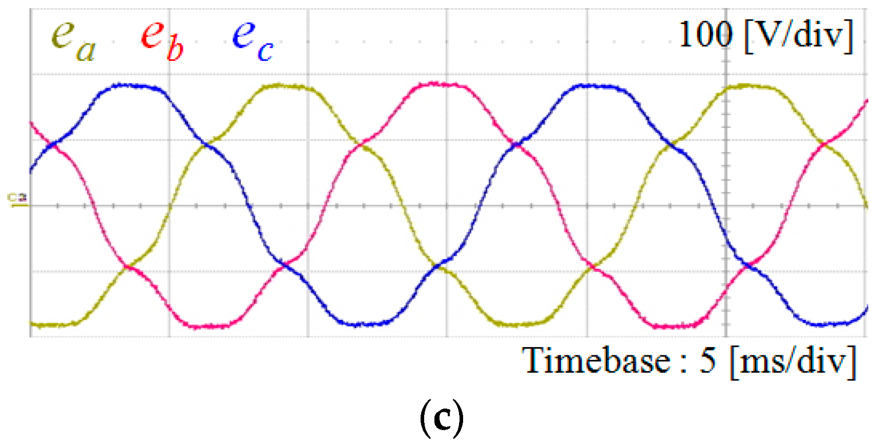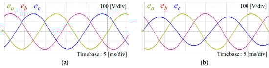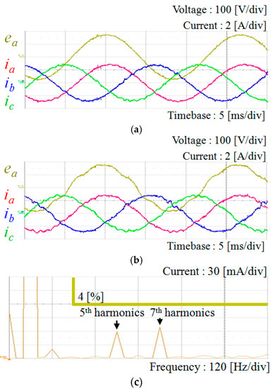 Figure 5 shows various grid voltages used for test purpose, which are generated by three-phase programmable AC power source. Figure 5a represents the ideal grid voltages in which the frequency is 60 Hz and the line-to-line voltage is 220 V in root-mean-square (RMS). Figure 5b shows three-phase unbalanced grid voltages with 20% magnitude reduction in c-phase. Figure 5c shows the harmonic distorted grid voltages including 5% of the fifth- and seventh-order harmonics, respectively.