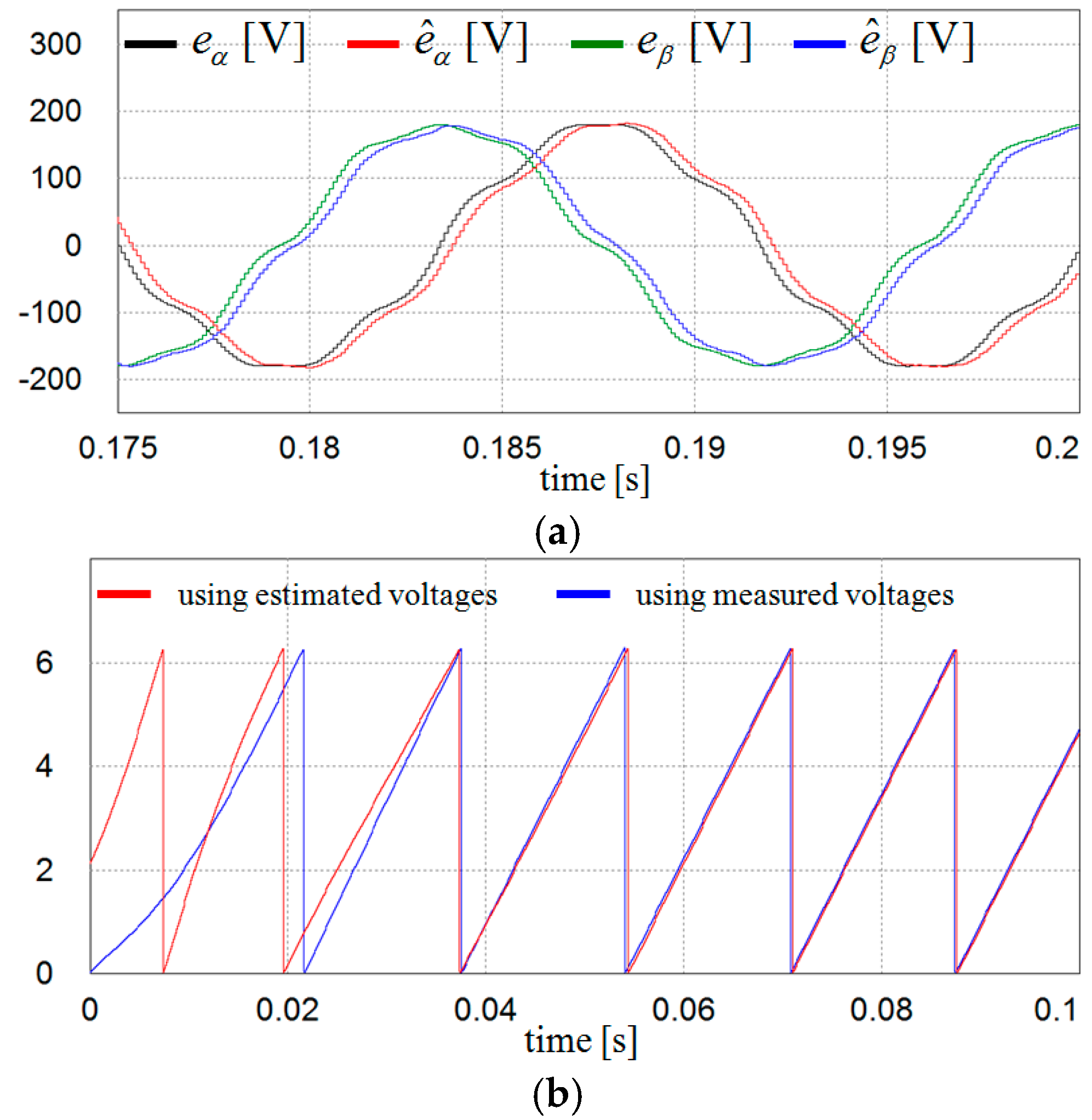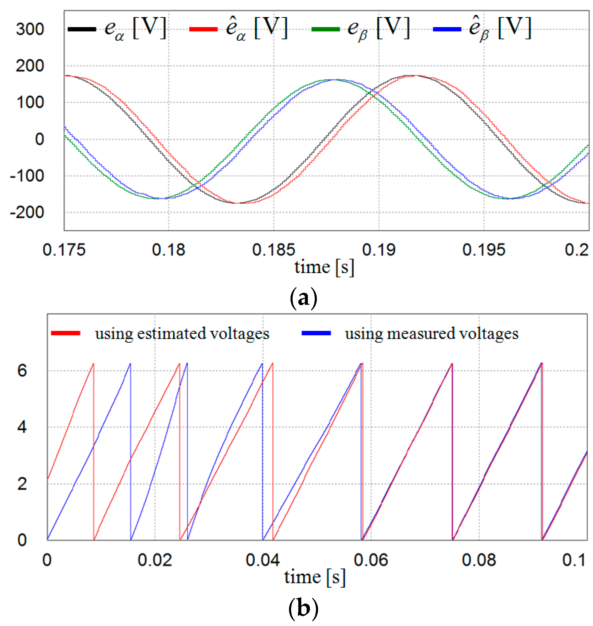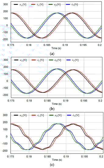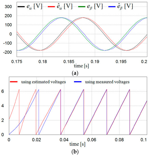 Figure 8 shows the simulation results for the estimation performance of the grid voltages and phase angle using the proposed scheme when the grid voltages have harmonic distortion as represented in Figure 5c. Despite the harmonic distortion, the proposed scheme shows an excellent performance in the estimation of the grid voltages as well as in the determination of the phase angle.