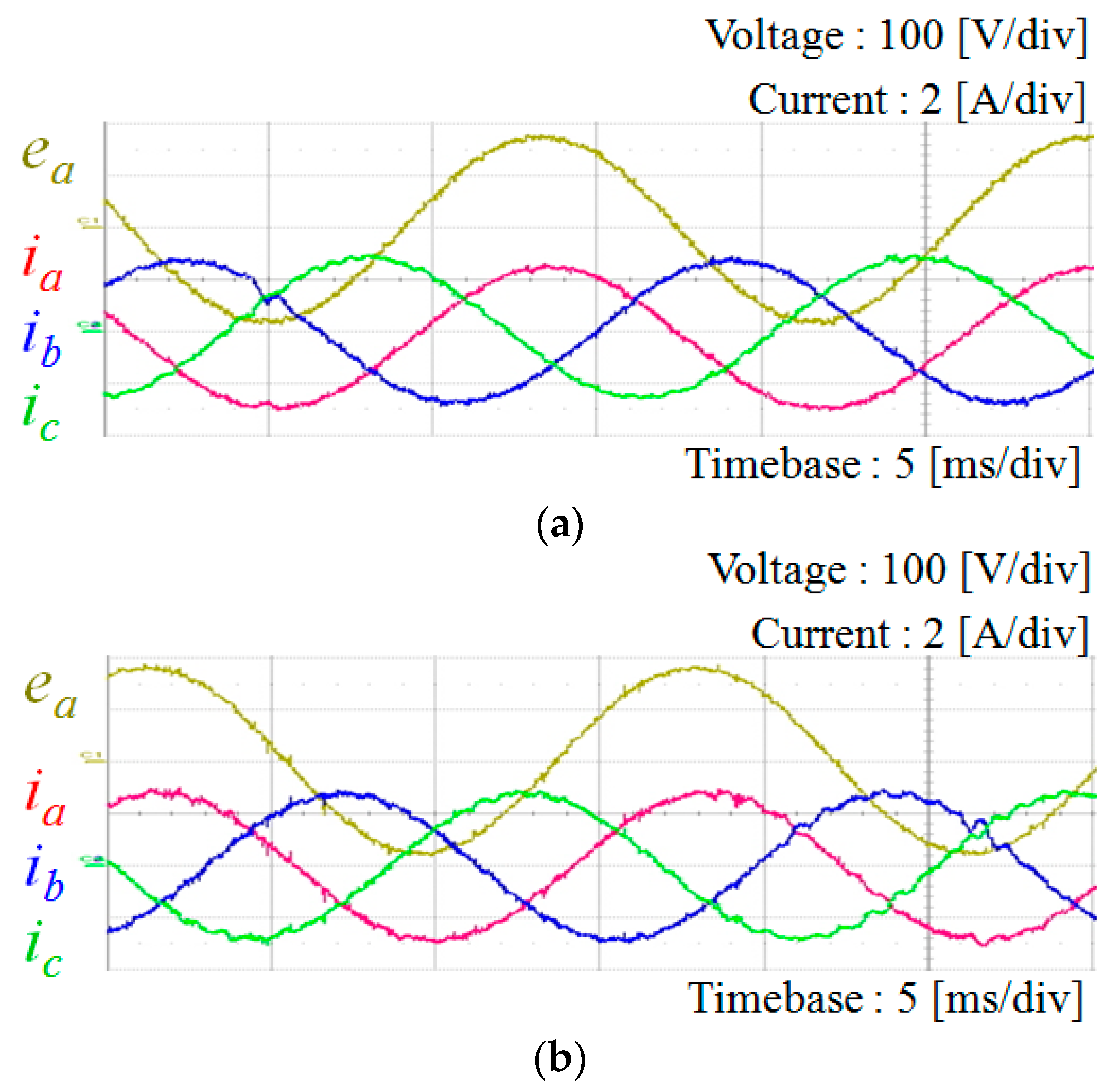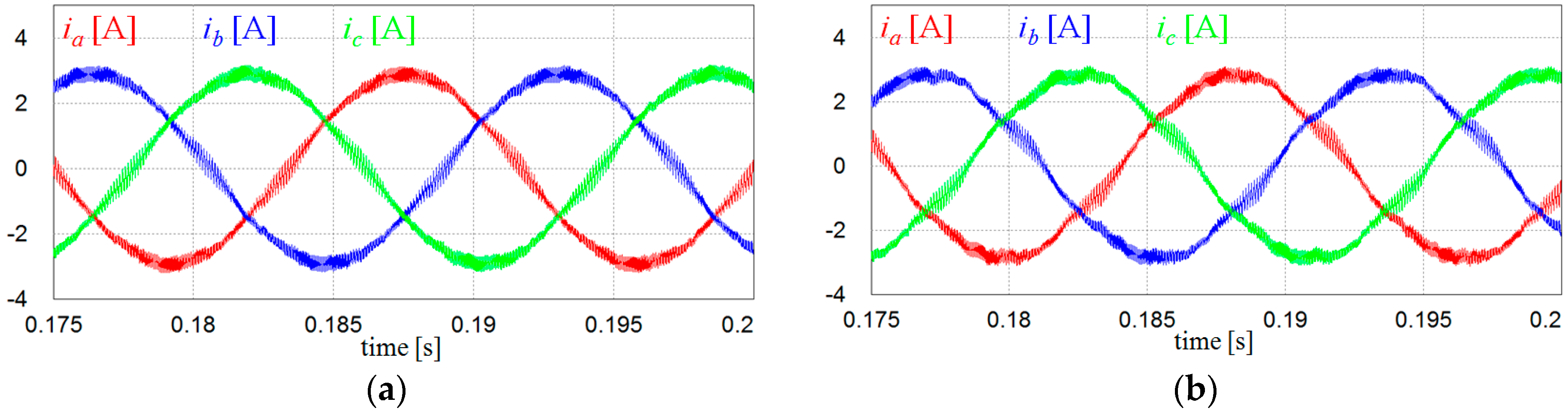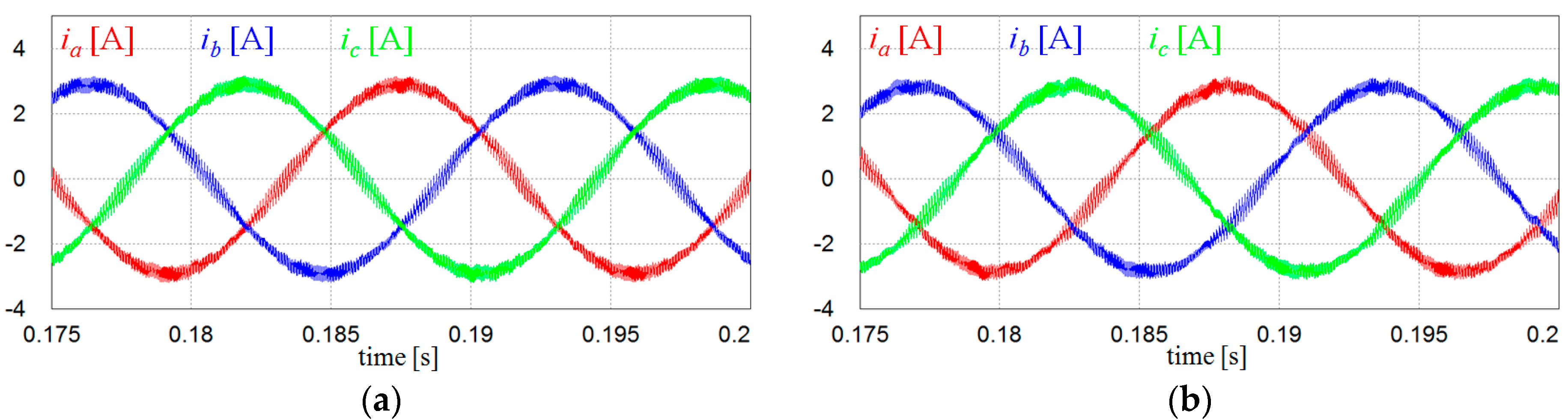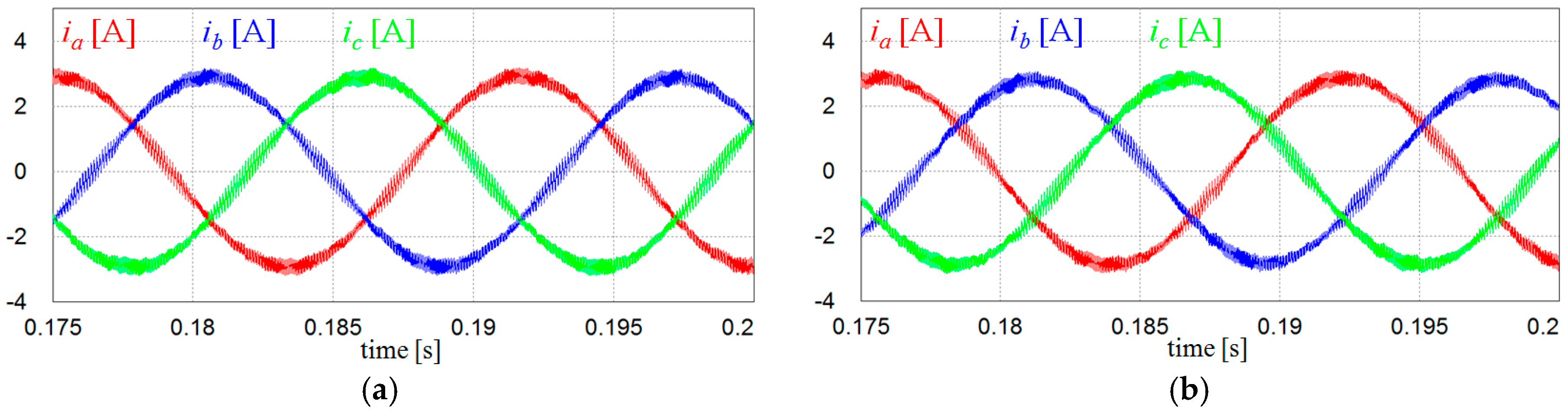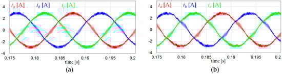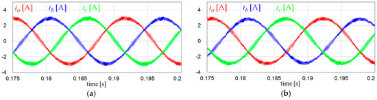 Comparison of inverter output currents under the ideal grid condition. (a) Inverter output currents with voltage measurements; and (b) inverter output currents with the proposed voltage-sensorless control.