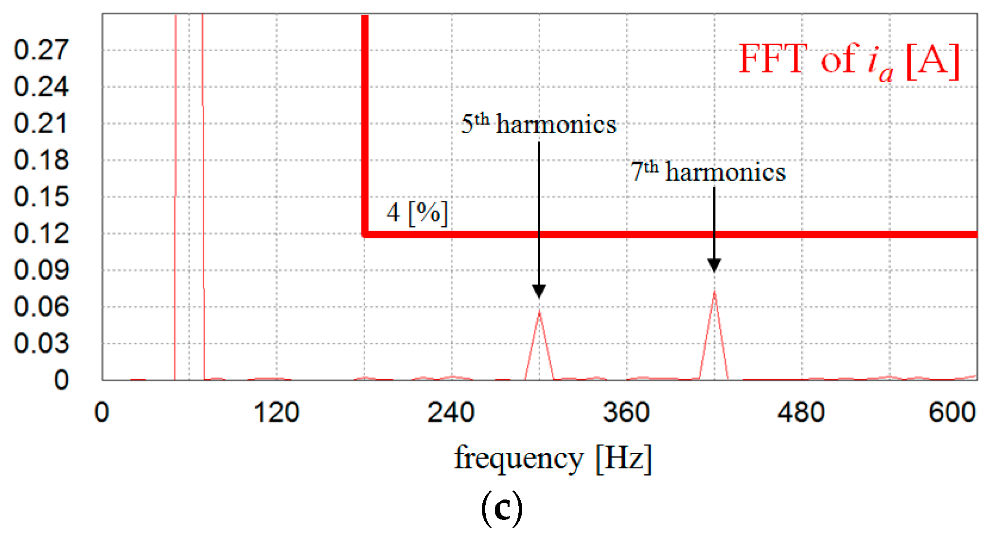 Figure 11 shows the comparative simulation results under the harmonic distorted grid condition as in Figure 5c for the schemes with and without the voltage sensors. Similar to the previous simulations, Figure 11a,b represents the inverter currents for the conventional and proposed scheme. On the other hand, Figure 11c shows the fast Fourier transform (FFT) result for a-phase current waveform in Figure 11b together with the harmonic limits on IEEE Standard 519-1992. In this case, both the current waveform and the power quality are slightly degraded in the proposed control scheme as compared with the conventional scheme due to the bandwidth limit of the LPF used in DOB. However, the harmonics on inverter currents are effectively maintained within the harmonic limits specified on IEEE Standard 519-1992 as in Figure 11c.