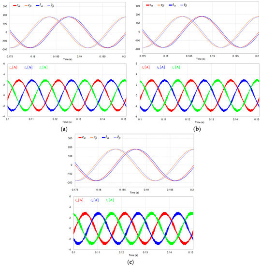 Figure 10 represents the comparative simulation results under three-phase unbalanced grid voltages as in Figure 5b for the schemes with and without the voltage sensors. It is clearly shown that both schemes yield similar current waveforms, which proves that the proposed scheme works well even in this condition.