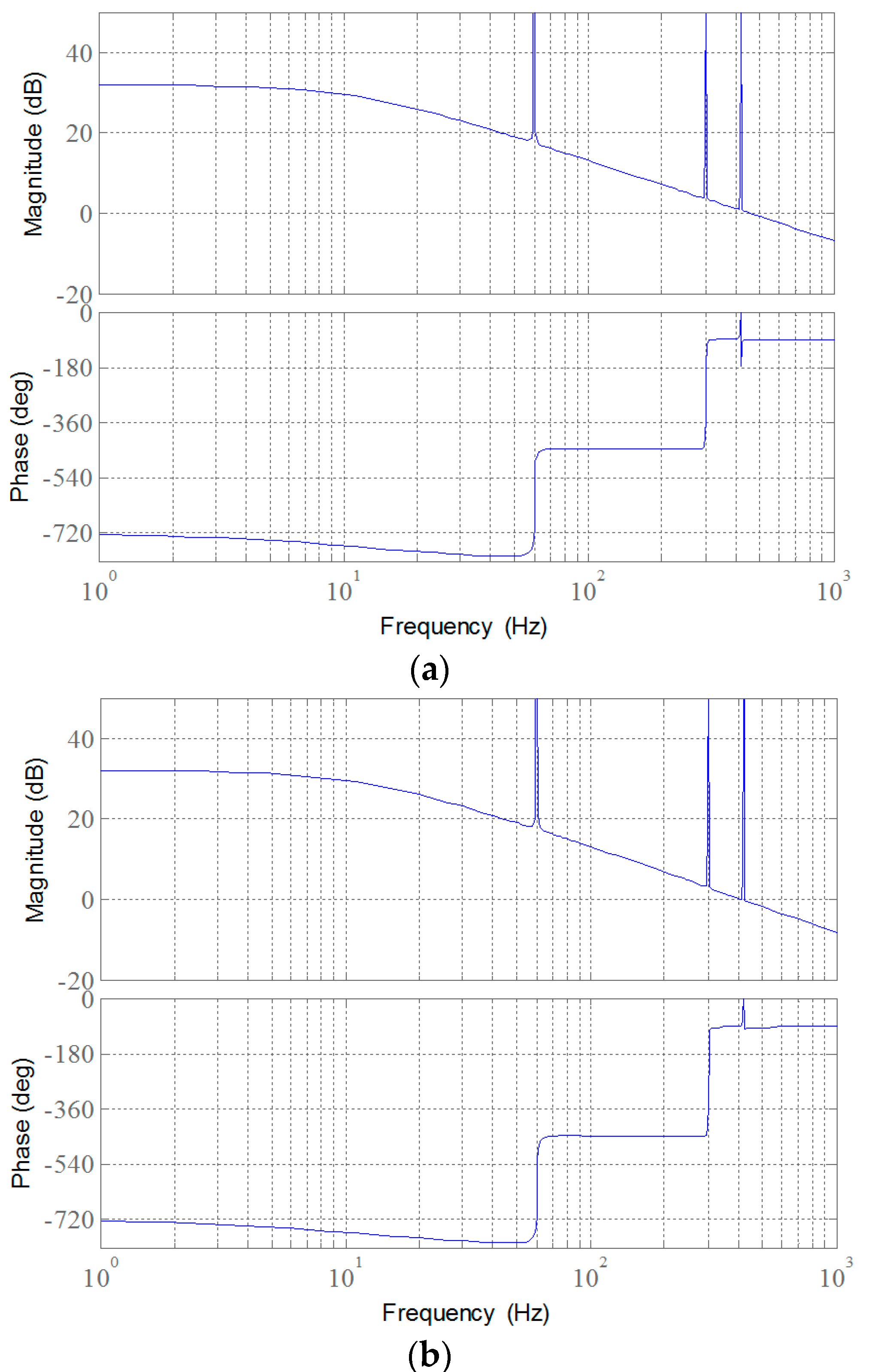Frequency responses for the open-loop transfer function under inductance variation. (a) Nominal value of inductance; and (b) +20% variation.