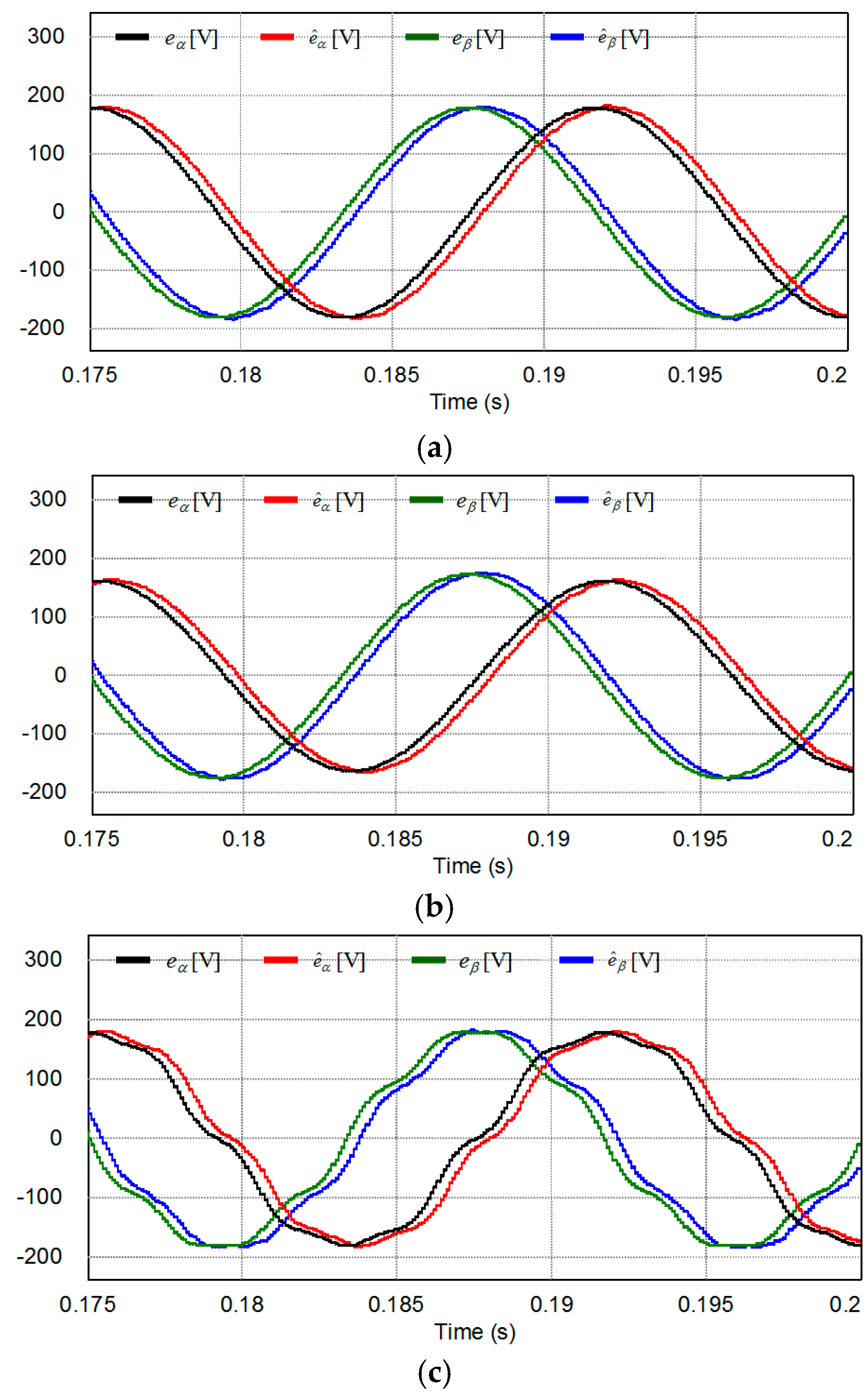 Estimation of grid voltages and inverter output currents under inductance variation. (a) +20% variation; (b) +10% variation; and (c) −20% variation.
