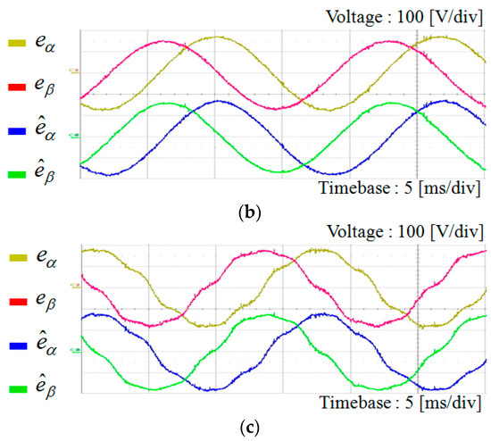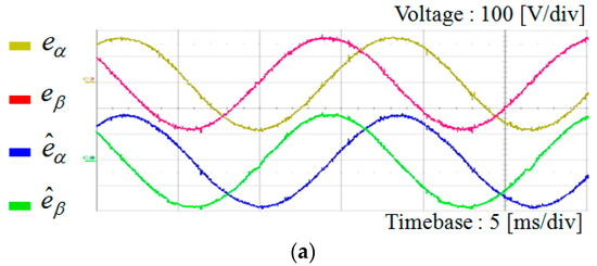 Figure 14 shows the estimation performance of grid voltages using the conventional linear Luenberger type disturbance observer under the ideal grid voltages, unbalanced grid voltages, and harmonic distorted grid voltages, respectively. The estimation performance of grid voltages is more or less similar to that of the proposed scheme depending on the observer error dynamics. This scheme also has the limitation that sinusoidally varying signals have to be tracked, and, thus, the current control performance will be much degraded without proper phase compensation.
