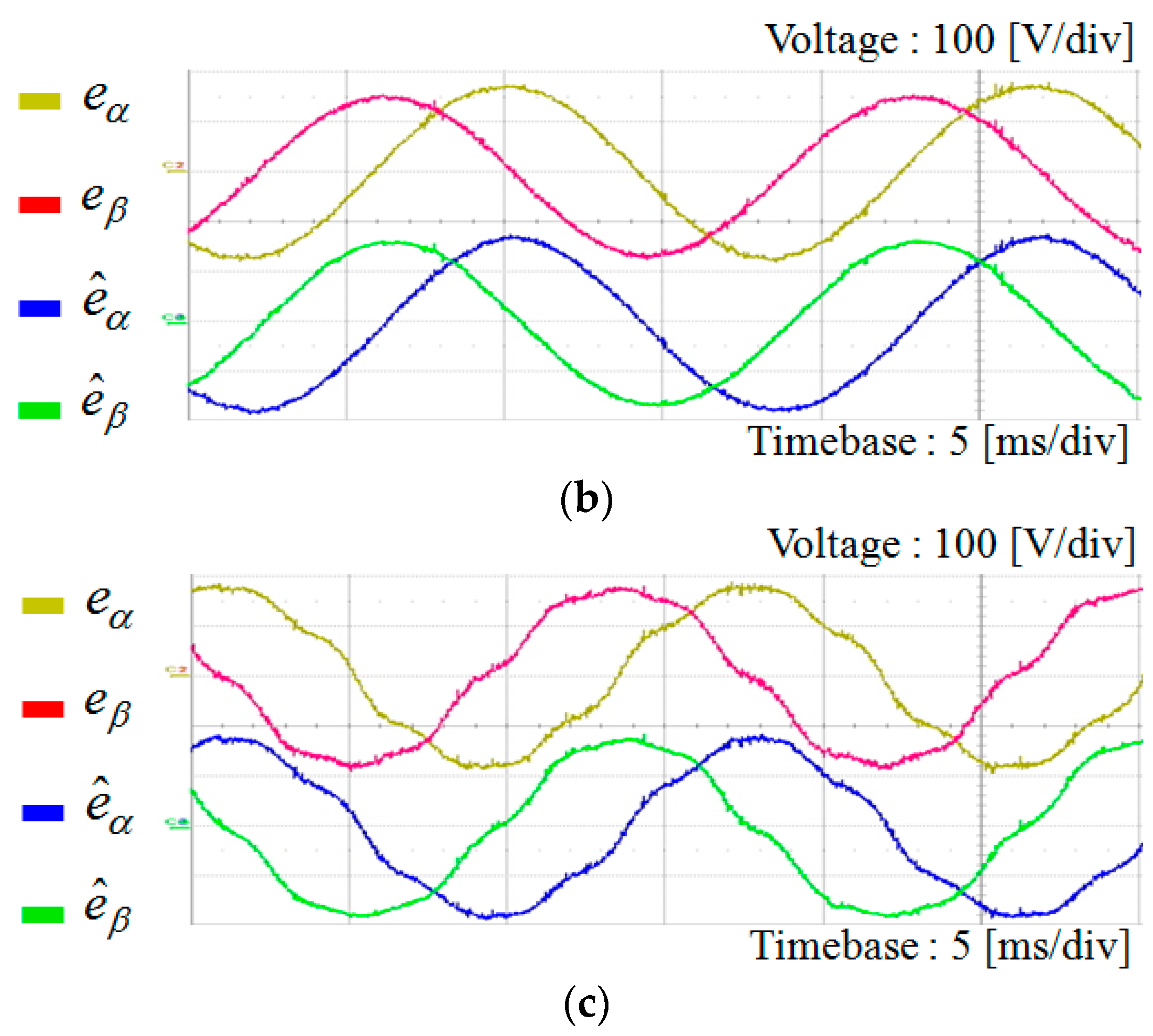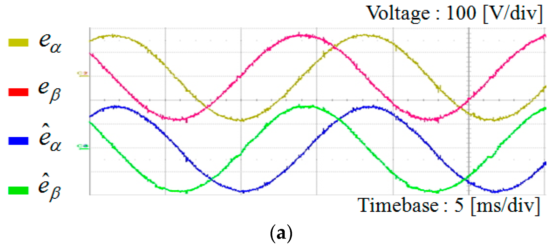 Figure 15 shows the experimental results for the DOB based estimating performance of grid voltages under three different grid conditions as presented in Figure 5. The experimental results accord well with the simulation results in Figure 6, Figure 7 and Figure 8, yielding the grid voltage information in a reasonable accuracy.