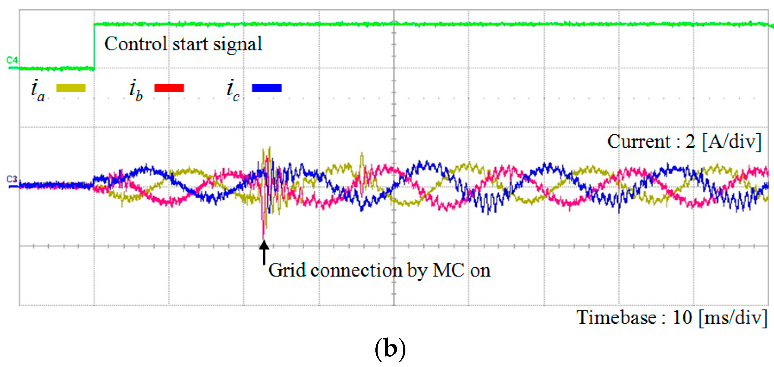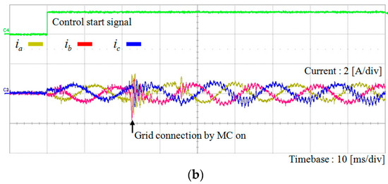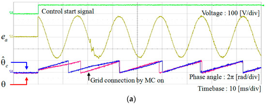 Figure 16 shows the experimental results for the phase angle estimation and transient current responses of the proposed voltage-sensorless control scheme at start-up under the ideal grid voltages in Figure 5a. In the initial stage, the current references are set to small value (0.5 A) to prevent large abrupt currents caused by the inaccurate phase angle information in the absence of the grid voltage estimation. Figure 16a represents the waveforms of the measured a-phase grid voltage and phase angle estimation. In this figure, denotes the phase angle obtained using the measured voltages, which is referred as the real phase angle of grid voltages and used for only comparison purpose. On the other hand, denotes the phase angle obtained using the estimated voltages with phase lead compensation, which is the phase angle determined by the proposed scheme. While the connection signal for the MC is given with the “control start signal” as shown in Figure 16a, it requires about 20 ms to operate. The connection instant is indicated by the “grid connection by MC on”. As soon as the MC is closed and the inverter is connected to grid, the DOB estimates the grid voltages properly. As a result, the proposed voltage-sensorless scheme detects the exact phase angle of grid voltages within two cycles. Figure 16b represents three-phase inverter current waveforms with the “control start signal” during the start-up process. Similarly, it takes about 20 ms for MC to connect. As soon as MC is connected, the inverter is in grid connected mode. From that instant, both the control input and system output signals are available for the DOB for the estimation of grid voltage and phase angle. Even though some oscillatory currents are observed due to dynamic characteristics of the DOB after MC connection to grid, such a transient behavior disappears in few milliseconds. As a result, despite the uncertainty due to the absence of voltage sensors, the proposed scheme stabilizes the system operation rapidly without giving a harmful damage to system.