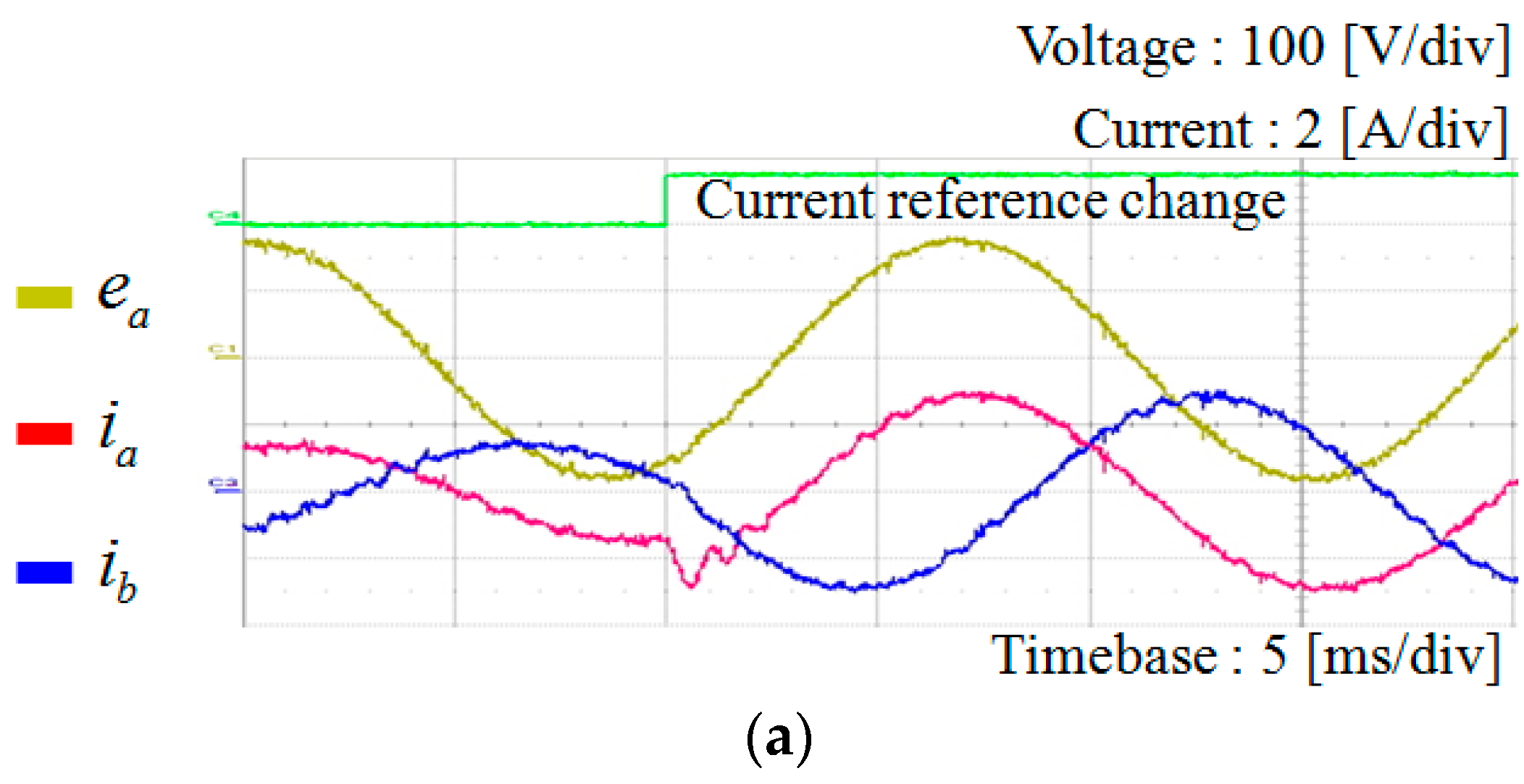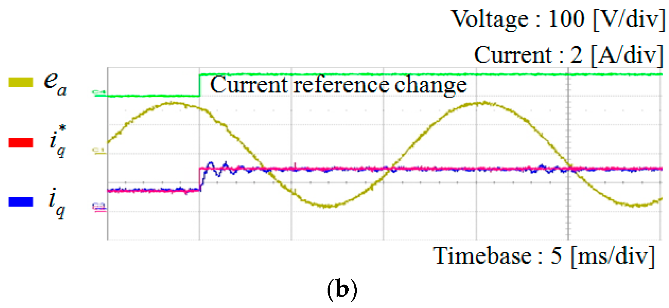 To demonstrate the transient performance of the proposed scheme, Figure 19 shows the experimental results under the step change in the q-axis current reference from 1.5 A to 3 A. Figure 19a shows a-phase and b-phase currents, and Figure 19b shows the q-axis current. As shown in these figures, despite a slight oscillation depending on the choice of resonant gains, the currents are controlled to the reference immediately. From these results, it is confirmed that the proposed scheme operates stably during transient periods.