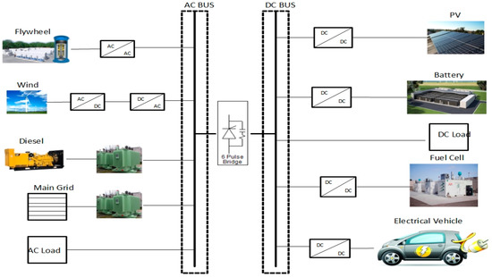 In a DC microgrid, energy storage devices and many sources and loads are interconnected through one or more DC buses. However, there will still be a need for AC microgrids because some sources and loads cannot be connected directly to a DC bus. Another prominent recent development in AC power systems is the addition of DGs and microgrids for integrating renewable power sources such as wind turbine generators, photovoltaic (PV) panels, fuel cell generators, energy storage systems (ESS), and electric vehicles (EV) into local distribution systems. Therefore, future grids will facilitate the connection of various AC and DC generation systems, energy storage options, and various AC and DC loads with optimal asset utilization and operation efficiency. In this way, a hybrid AC/DC microgrid reduces the multiple reverse conversions required in individual AC or DC grids (Figure 1).