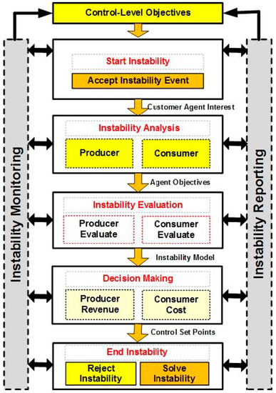 As mentioned before, this paper uses five stages for solving the problem in the microgrid. When instability has occurred, it is important to recognize its causes. For this stage, data collection is very important. Agents in a control system should have more information about their region. Evaluation is critical after this stage to make a good decision. Data evaluating can help the agent to conduct in the best way for decision making. After all of these stages, the agent should decide to retrieve grid from instability. This is the instability life cycle in our multi-agent system (Figure 8). It is obvious that all stages communicate with the management system to reach the best solution.