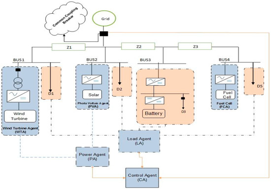 In the context of power systems, multi-agent technologies can be used in a variety of applications, such as power system disturbance diagnosis [30], power system restoration [31] and power system secondary voltage control [32]. Agents in the multi-agent system interact cooperatively [33] to optimize the operation of the microgrid. Moreover, some of the most recent works [34] have implemented MAS to control microgrid operations. Power system modeling based on a multi-agent is a promising approach to provide a common communication interface for all equipment. Moreover, the nature of distribution and potential for modeling autonomous decision-making entities in solving complex problems motivates the use of MAS [35]. The presented paper uses MAS for secondary microgrid control. Each agent can perform its tasks independently. Furthermore, agents can have some data exchanged concurrently to improve their operations. Thus, this scheme reduces communication requirements. Moreover, the control logic can be changed based on different societies’ agents defined for MAS levels.