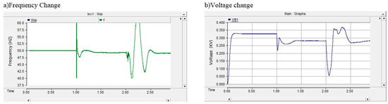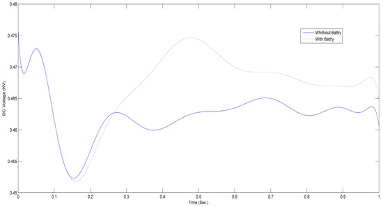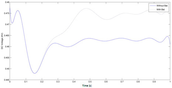 Load changes in the network are also effective on frequency. Normally, load changes will reduce the frequency and will cause instability in the network. In Figure 13, based on the designed scenario, the load is added to the network. The results with the presence of battery and without it with the multi-agent control system are shown in Figure 13. It is seen that if the battery is not available in the network, the voltage of DC bus will slowly increase because the response of the control resources with PQ control is slow. In the second curve, however, the multi-agent control system will simultaneously add battery into the circuit after load increase in the network. This battery significantly increases DC voltage in bus3 within 0.3 s. This procedure gives enough time to the renewable resources to increase their power to prevent DC voltage drop. In fact, as in the previous analysis, the storage resource gives the control system the opportunity to easily compensate for the delay response of other renewable and distributed generations (DG) thus increasing their production.