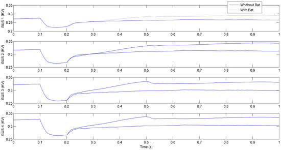 The first analysis examined is the AC voltage buses. AC voltage in both conditions with and without the presence of storage resources is shown in Figure 12. It is clearly seen that the control system detects the load increasing during 0.1 s and has adopted the desired decisions. Also, the battery will be fully discharged within 0.3 s in the network. By injecting power in the network by way of batteries, the network’s voltage is increased and gives this opportunity to the multi-agent control system to use other resources’ power to compensate for the power drop. Voltage in different buses had improved on an average around 16%. This increase in voltage will decrease reactive power in transmission lines. As a result, network lines’ losses and congestion will be significantly reduced.