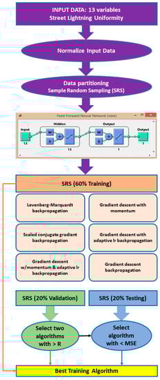 This section describes the process followed in the development of the neural network and the experiments performed to select the optimal training algorithm. To do that, the Matlab software (R2015b, Mathworks, Natick, MA, USA) package and its nnstart tool were used. The experiment data consisted on 260 values for street lighting uniformity; all of them matched the specification of the 13 variables of the installation structure (see Table 1).