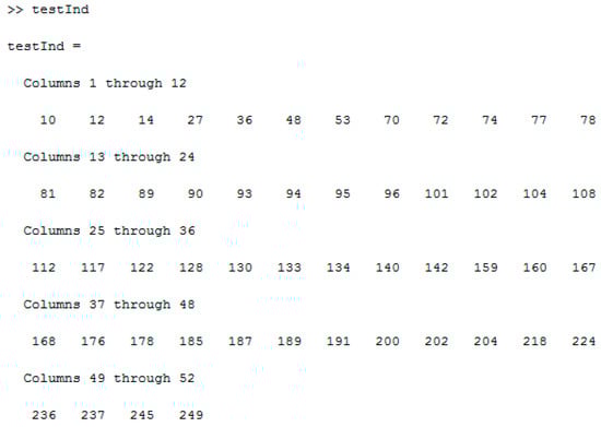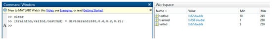 In this case, the dividerand function separates the targets into three sets and returns the training references in the trainInd variable, the validation references in the valInd variable and the test references in the testInd variable (Figure 5). We can use this information to create the specific datasets to use in every step of the ANN development (Figure 6).