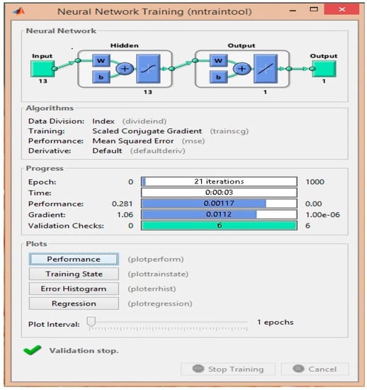 Figure 13 shows the evolution of the error (as target—output) while the ANN is trained to fit the desired value for the cost function.