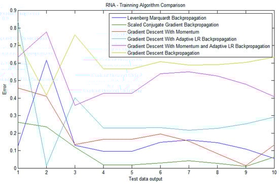 Once training is completed, we can use the information provided by nntraintool to analyze the results obtained with every algorithm. First, the performance button plots a graph with the error found in the training step. The performance of the six algorithms in terms of error was compared in the Figure 9. It is possible to check that both the scaled conjugate gradient back-propagation and Levenberg-Marquardt back-propagation algorithms are the closest to the desired output because they present the lowest errors.
