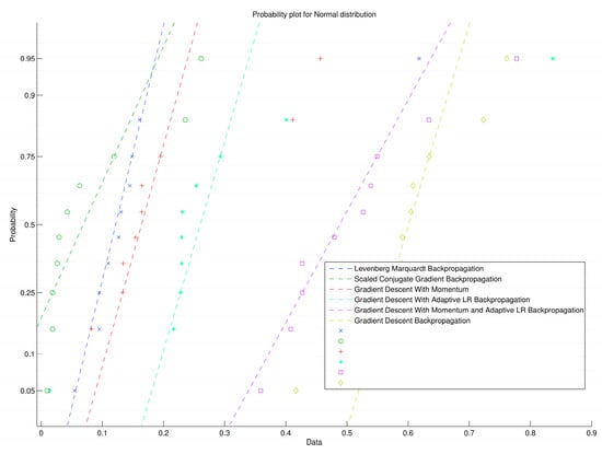 Next, for every training algorithm and for every phase (training, validation and testing), information about the mean squared error (MSE) and the regression (R) values was obtained. Table 2 compares the MSE and the R values. The highest regression value for the training process) was obtained with the gradient descent back-propagation. For the validation process, the highest regression value was obtained using the Levenberg-Marquardt back-propagation (0.899) method and for the test process, it was obtained using the gradient descent back-propagation (0.812). Although the Levenberg-Marquardt back-propagation training algorithm presents the lowest MSE values in all the processes, and according with our validation process (in Section 3.8), we can conclude that the best training algorithm is the Levenberg-Marquardt back-propagation one.