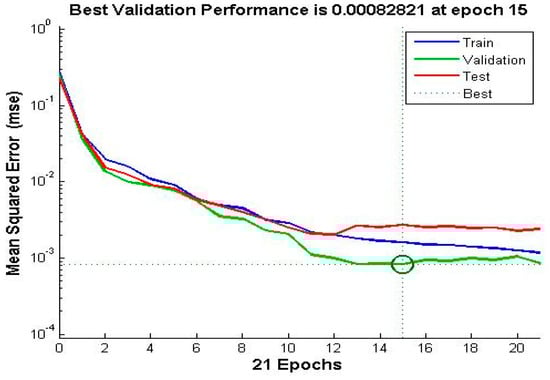 These checks ensure that the best results for the ANN are obtained with the Levenberg-Marquardt back-propagation algorithm, so estimations are very close to the desired output. Overall results after the training, validation and testing phases of the ANN are shown in Figure 11, where it can be seen that the ANN fits the best value after 15 epochs.