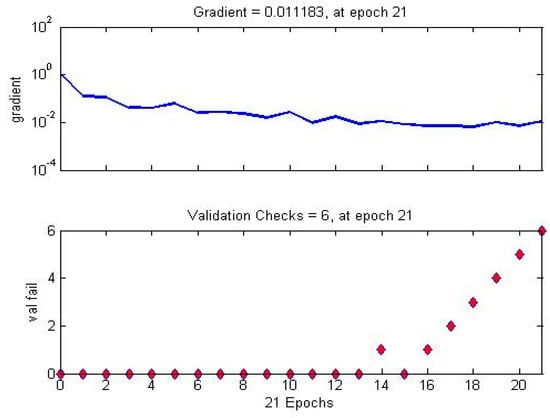 Next, Figure 12 shows the evolution of the gradient in the search of the minimum of the cost function (uniformity) versus the number of validation checks. The magnitude of the gradient and the number of validation checks are used to terminate the training. The gradient will become very small as the training reaches a minimum of its performance. The number of validation checks represents the number of successive iterations that the validation performance fails to decrease.