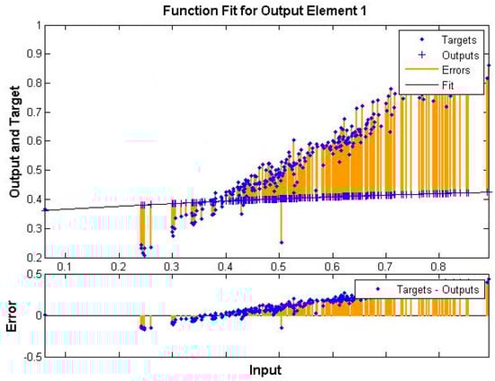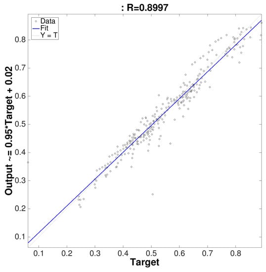 Finally, in the Figure 15, the learning curve of our neural network can be compared with the best training algorithm. This graph shows a regression analysis between the response of the network and the desired objectives. The value of R indicates the correlation coefficient between outputs and objectives. This value corresponds with the R-value shown in Table 2 for the Levenberg-Marquardt back-propagation training function in the validation step. The output tracks the targets very well for validation, and the R-value is over 0.96, that is, the network response is satisfactory.