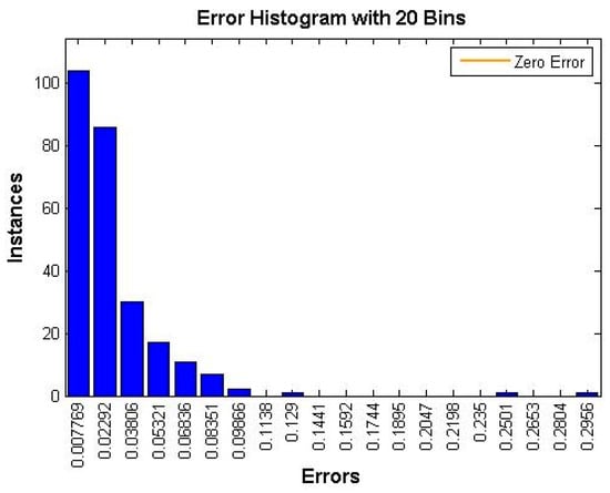 Next, Figure 14 shows a histogram with the evolution of the error depending of the number of instances used in the ANN training phase. The histogram can give us an indication of outliers, which are data points where the fit is significantly worse than for the majority of the data. In this case, as the number of instances increases, the error decreases.