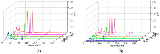 Figure 12 shows the pressure fluctuation spectra on monitoring points IPS1–IPS5 on the blade pressure side. For tip clearances of 0.0 mm, 0.2 mm and 0.65 mm, the dominant frequencies are mainly 145 Hz, corresponding to six times the impeller rotation frequency, which is closely related to the rotor stator interaction between the impeller and guide vane. For different tip clearance sizes, as the pressure increases due to the power input from the main shaft, the maximum amplitudes of the dominant frequencies synchronously increase from IPS1 to IPS4, but the maximum amplitudes drop at IPS5 for δ = 0.0 mm and δ = 0.2 mm, which can be ascribed to the jet wake flow structure at the impeller outlet. For a tip clearance of 1.0 mm, the amplitudes of the dominant frequencies are significantly enhanced, especially at the blade trailing edge. The reason is that the pressure fluctuation is not only influenced by the impeller rotation, but also by the leakage flow. When the tip clearance size increases to 1.0 mm, the leakage flow is greatly strengthened and the flow pattern becomes more complicated.