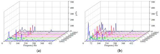 Figure 13 shows the pressure fluctuation spectra at monitoring points TIPM1-TIPM7 on the blade tip. For δ = 0.2 mm and δ = 0.65 mm, the high amplitudes are mainly concentrated at low frequencies, while for δ = 1.0 mm, the dominant frequencies move to 184 Hz, and the variation trend is the same as that of blade due to the complicated flow pattern. Meanwhile, the maximum amplitudes of the dominant frequencies greatly increase when the tip clearance size reaches 1.0 mm.