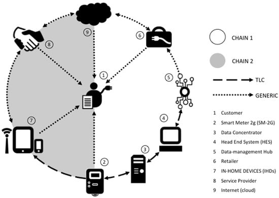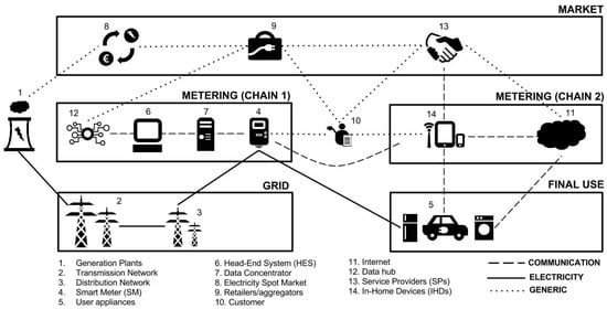 In this article we only consider the electricity value chain and we refer to electric SMs as simply SM. Given the crucial role of the SM in the electricity value chain, various regulatory authorities have defined its main characteristics. According to Directive 2004/22/EC of the European Commission regarding measuring instruments (MID), SM must show the results of the metering process directly at the customer’s premises at least through a display or other more sophisticated system. It has to be user-friendly and long-lived, ensuring a future-proof nature. More than one physical quantity can be collected (e.g., active energy, reactive energy, power usage, and voltage) and even stored within the SM registers for many days in order to cope with the possible unavailability of the communications channel used for data exchange with the HES.