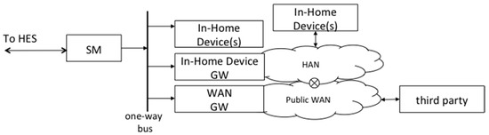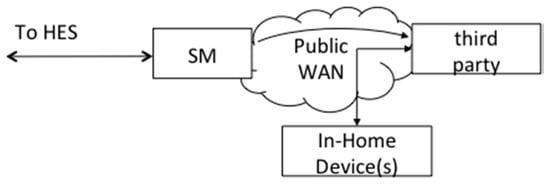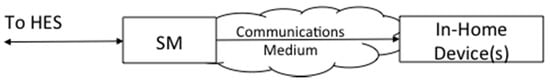 Figure 3 shows the first architecture, in which the SM directly sends the data to the consumer devices. In its simplest form, the IHD for this case could be, for instance, an external display showing real-time measurements to the customer or a device with limited home automation capabilities. The main characteristics of this architecture are: