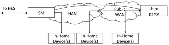 Figure 4 shows the second architecture, in which the SM is connected to the consumer’s HAN and makes metering data available for locally connected IHDs. Eventually, an authorized third party can withdraw these data from the HAN, moving them through a WAN. In turn, the third party will be able to communicate to consumer smart devices locally connected to the cellular network or to the Internet. The main characteristics of this architecture are: