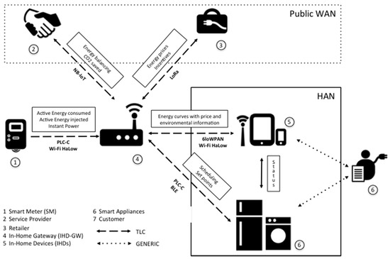 An additional advantage of SMs is feedback to customers about energy flows at their connection points, which allows them to have a better awareness of their consumption behaviors. The more information is available, the higher the customer flexibility and their capability to control their own consumption. There are several use cases requiring that metering data reach the customer as quickly as possible in order to let them react close to the time of utilization. DSOs and retailers cannot provide such data with a low latency, because the data-collection process is engineered to maximize the availability and correctness of the collected data, thus implementing time-consuming data retransmission and validation processes. The only feasible solution is to enable direct transmission of raw data from the SM to devices located near the customer’s premises [8]. In-Home Devices (IHDs) such as simple displays, smartphones, or web-based portals fed by SM raw metering data, can increase energy savings. They can even combine electric measurements with other data (e.g., tariffs, saved CO2, neighbors’ consumption, etc.) with the goal of supplying more valuable and enriched information for energy savings [9,10]. Some studies [11,12] show that real-time feedback can be interesting to the final customers if: