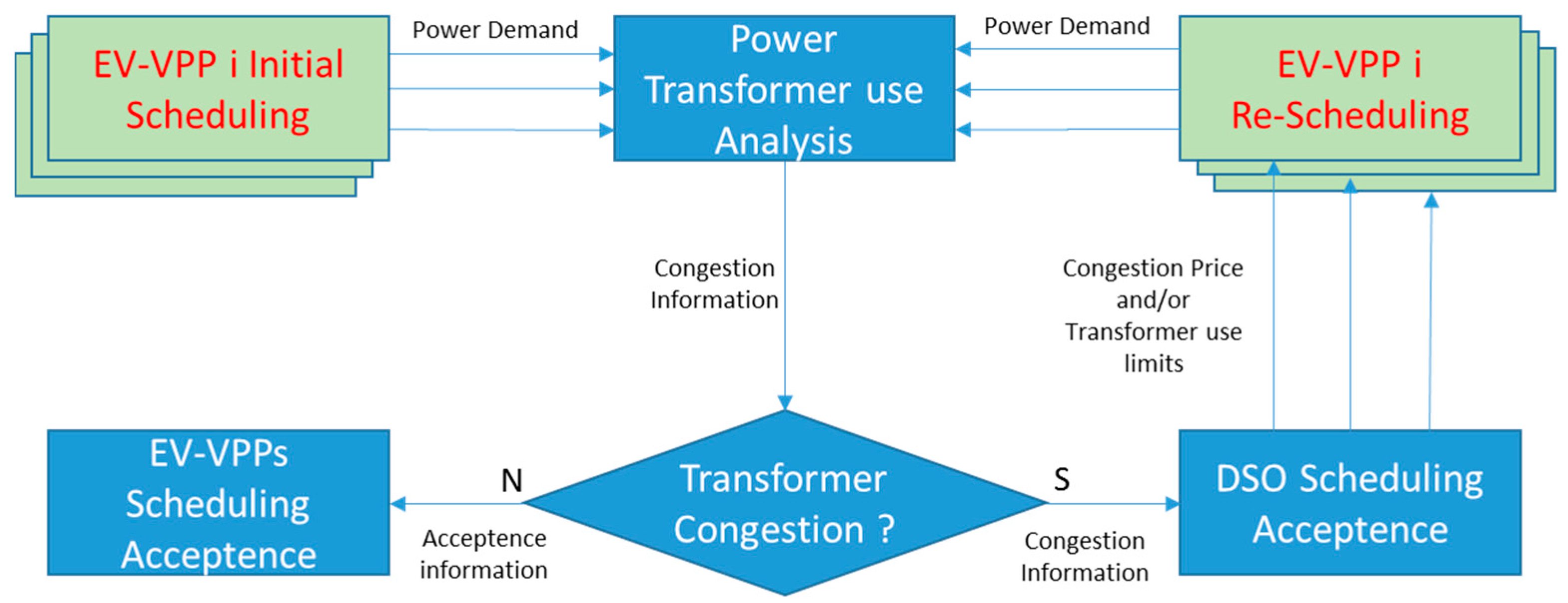 After solving the optimization problem, the EVs charge and discharge scheduling of each EV-VPP should be informed to the DSO. If a HV/MV power transformer congestion situation occurs in some periods, the DSO should define a congestion price or a new power supply limit to the EV-VPP at level II. In this case, the EV-VPP should re-execute the optimization algorithm considering the new information provided by the DSO. This sequence can be executed more than one iteration until all of the congestion situations are solved. When all of the congestion situations are solved, the EV-VPP should communicate the final scheduling to the EVs.