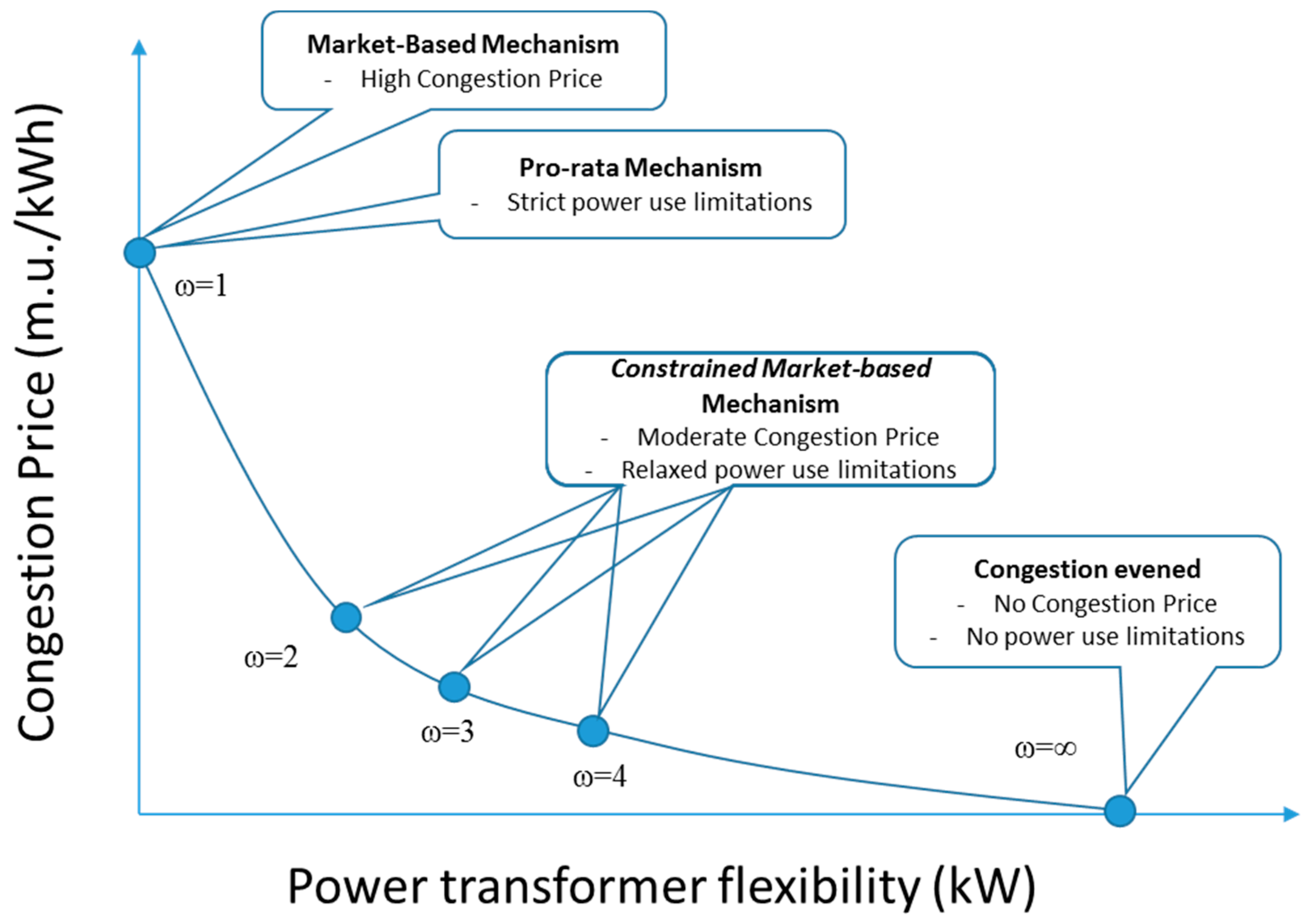 The main difference with respect to the pro-rata mechanism is the introduction of the ω parameter. This parameter allows defining different limits in the power transformer use. If ω = 1, the power transformer use limitations are the same of pro-rata mechanism defined in Equation (19). However, if ω > 1, less strict power limitations are imposed to the EV-VPPs, representing more flexibility for each EV-VPP. When ω = ∞, no power limitation is imposed to the EV-VPPs. Figure 3 presents the impact of ω in the proposed mechanism.