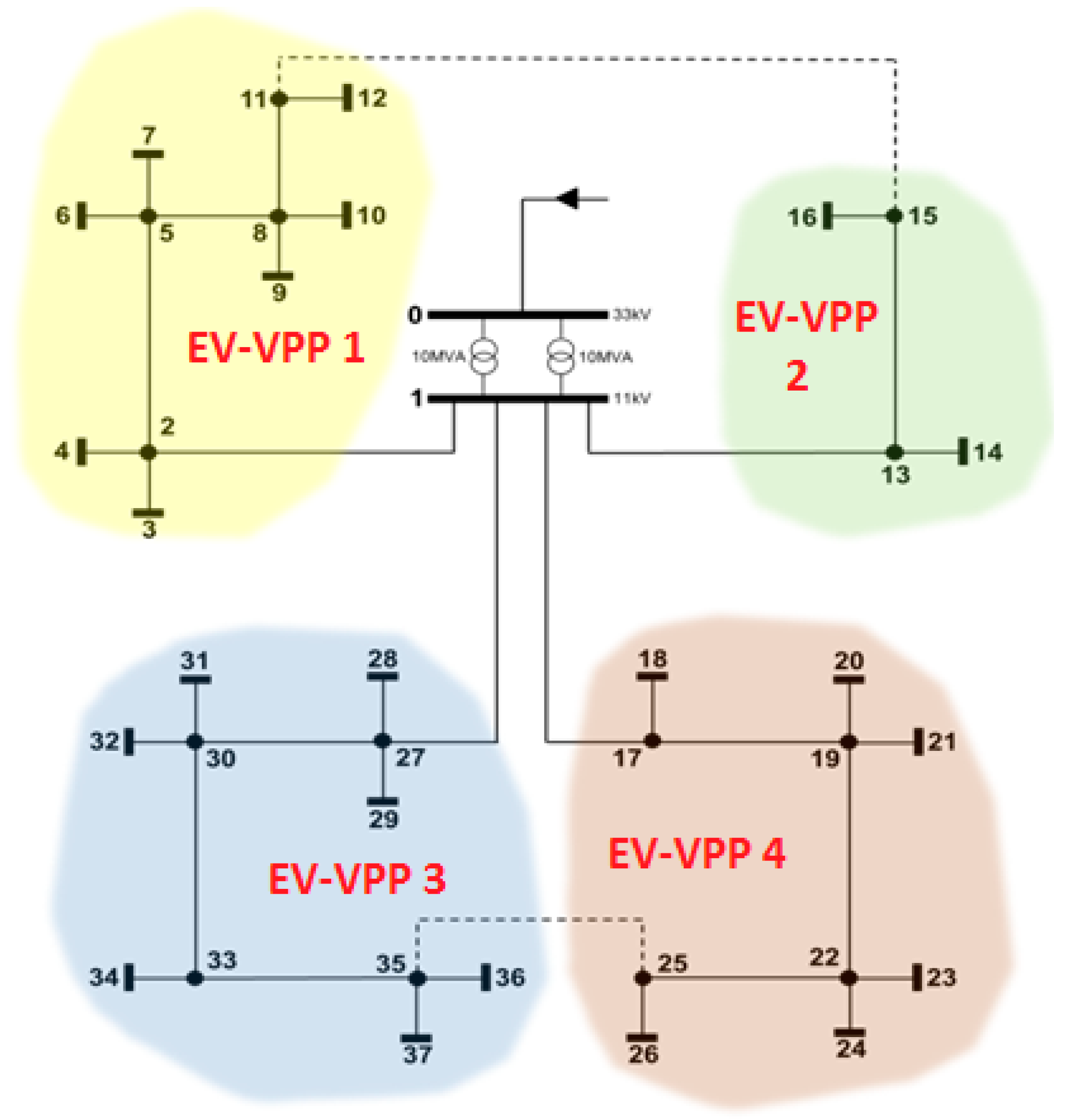 This section presents a case study considering the distribution network presented in [30] and shown in Figure 4. The distribution network is composed by 37 buses, connected to the high-voltage network through two 10 MVA power transformers. The distribution network supplies energy to 1908 consumers: 1850 domestic consumers (DM), two industries (Ind), 50 commerce-oriented stores (Co), and six service buildings (SB) [31]. Regarding EVs, a penetration of around 50% of the total number of vehicles is assumed, i.e., 1053 EVs. Table 1 shows the number of EVs and the number of each type of consumer for every EV-VPP. The EVs’ characteristics were determined based on the characteristics of some real models and driving patterns presented in [32]. The study assumes that all of the reactive power is supplied by the capacitor banks that are connected to the secondary side of the power transformers. It is also assumed that four EV-VPPs manage the EVs in different parts of the distribution network, and the total power transfer capacity is 19 MW in all periods.