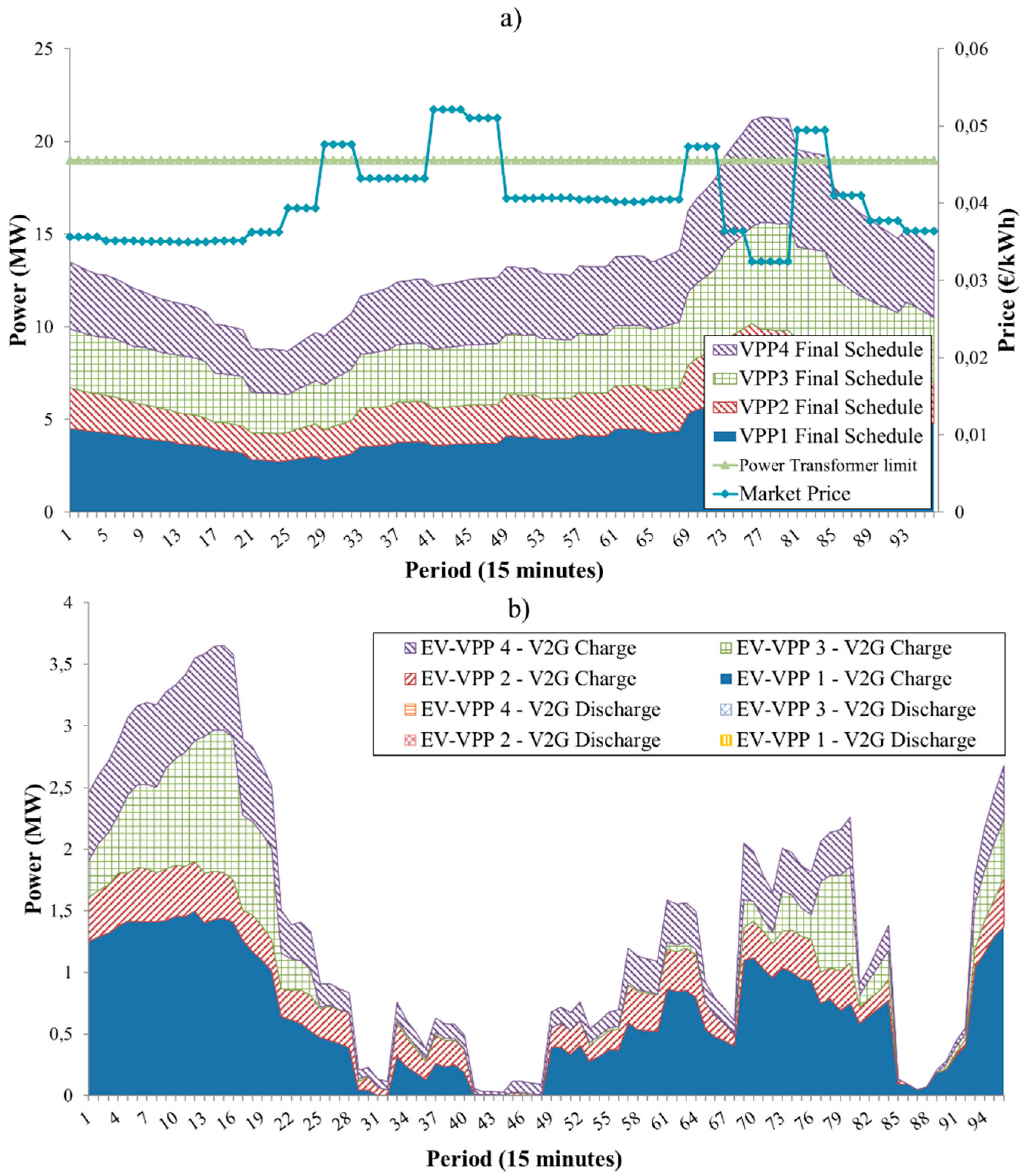Figure 5a shows the aggregated power schedule of EV-VPPs and Figure 5b shows the EVs charge scheduling after the first scheduling process. The graphics show the scheduling for one day (96 periods of 15 min). In Figure 5a, it is also possible to see the market prices (line blue) and the power transformer capacity (line green).