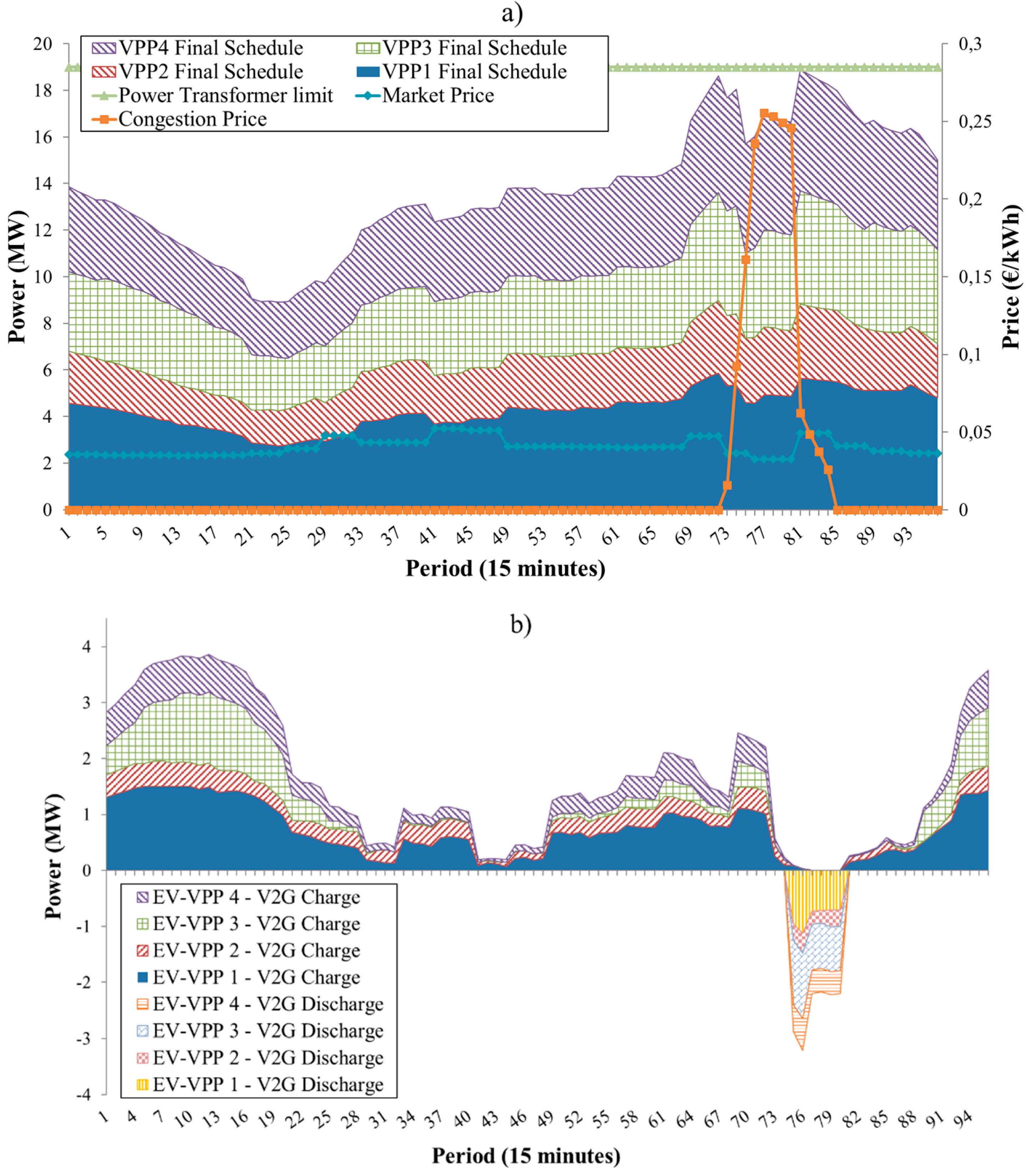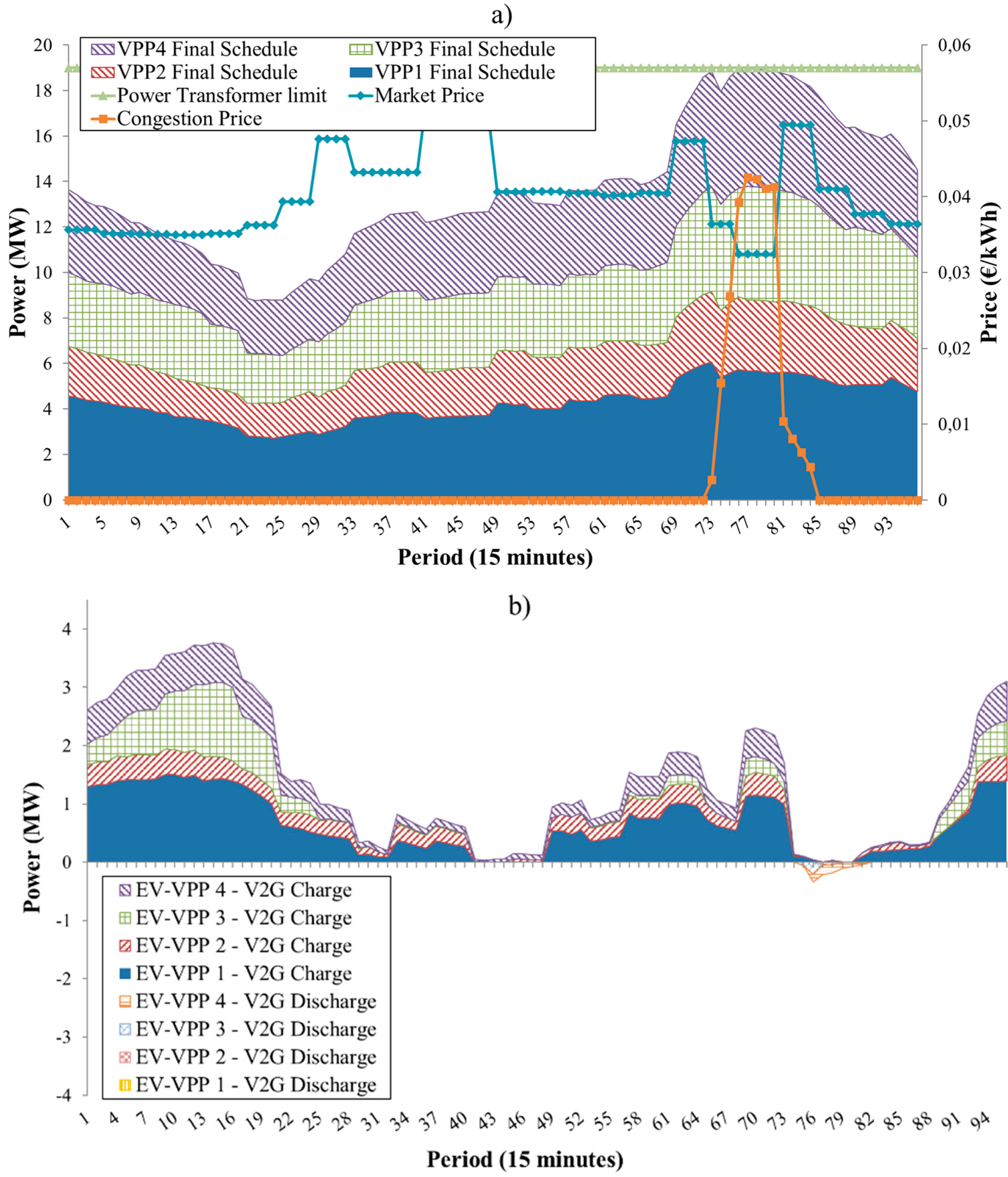 As seen in Figure 5, the EV-VPPs attempt to schedule the greatest part of the EV charges to periods with a lower energy price. In some cases, like in EV-VPP2, it is necessary to schedule the EVs charge during the day due to the intensive EV use. The initial scheduling causes the congestion of the HV/MV power transformer between periods 73 and 80 (periods of 15 min). This situation is, partly, caused by the intensive charging level of EVs, which reaches more than 3 MW due to the lower prices in those periods.
